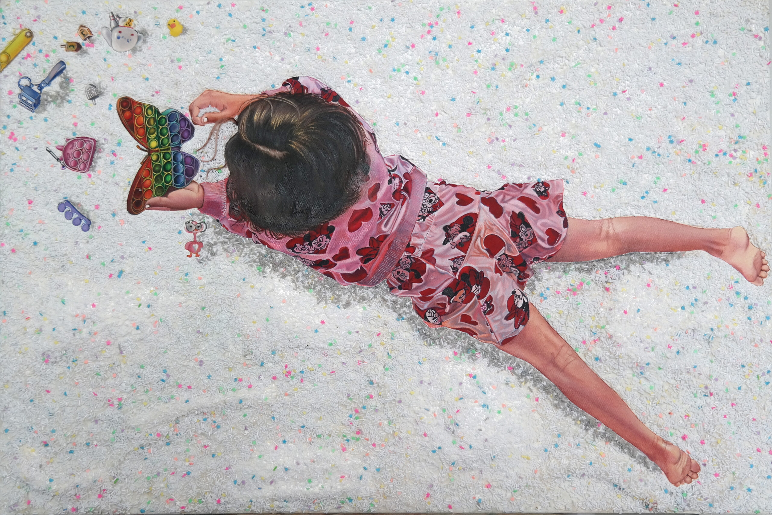 In this oil on canvas painting titled “Holding On” portrays that whatever we possess today is meant to be not there forever. The girl who is held by her mother is holding a toy flamingo herself, which signifies potential and balance.